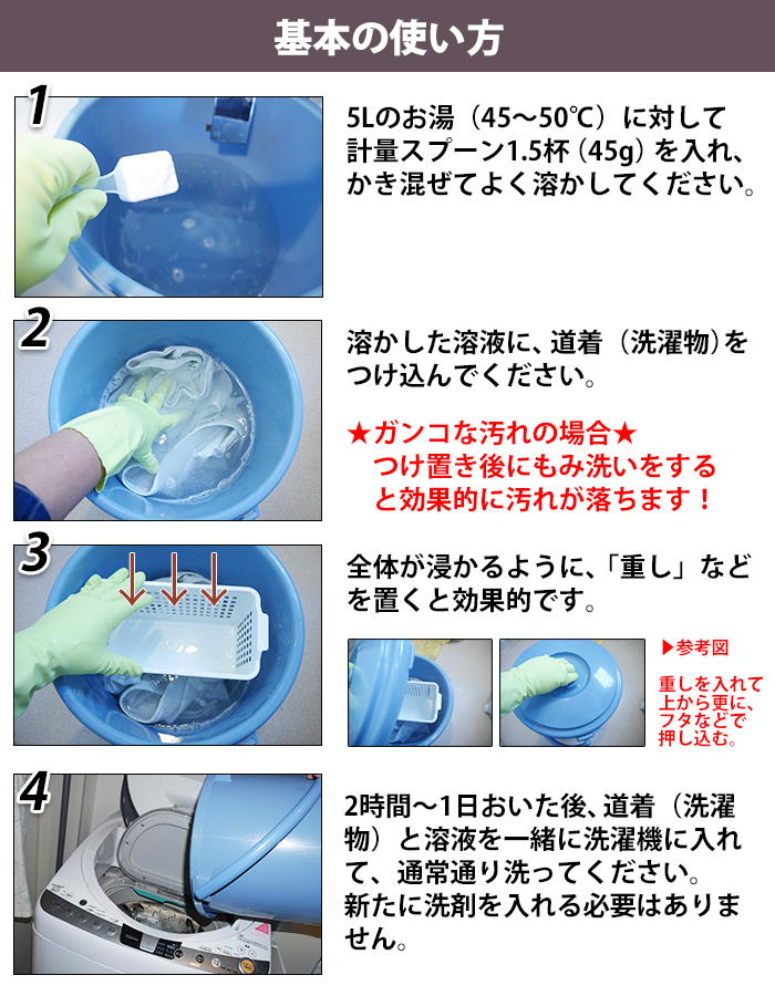 | 成 分 | 界面活性剤13%(エーテル系非イオン界面活性剤、α-オレフィンスルホン酸ソーダ)、漂白剤(酸素系)、アルカリ剤、水質軟化剤、酵素、蛍光染料、香料 |