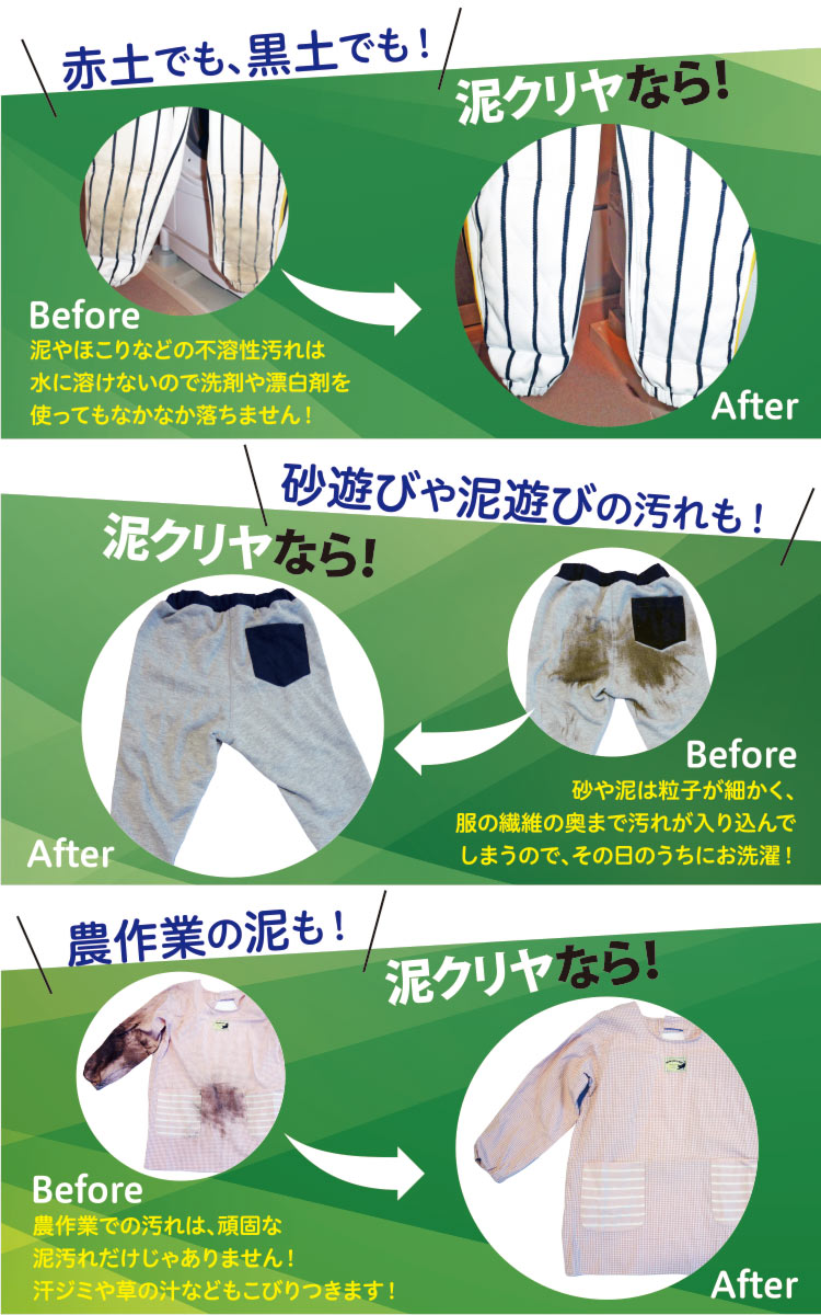 「泥クリヤグリーン」は「泥クリヤ」の無リン版です。泥汚れにお悩みでも有リン洗剤が購入できなかった地域のお母さんの声に応えて開発しました。