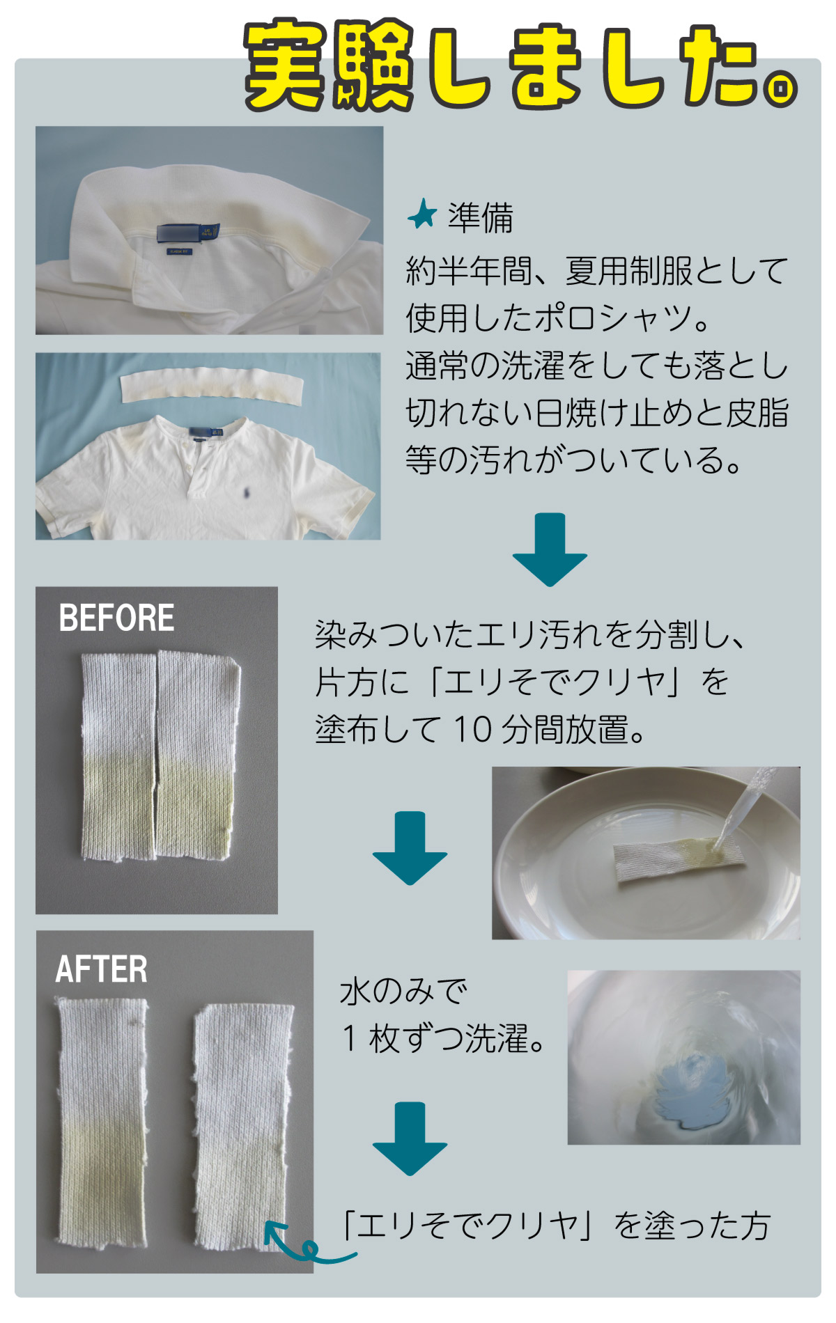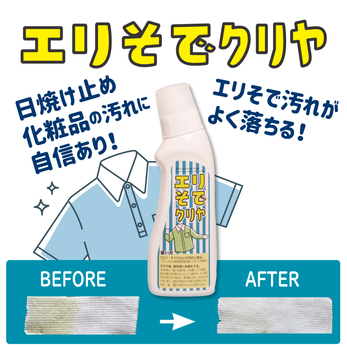 『エリそでクリヤ』は、日常の洗濯で頭を悩ませる襟や袖の汚れを手軽に解決する洗濯補助剤です。