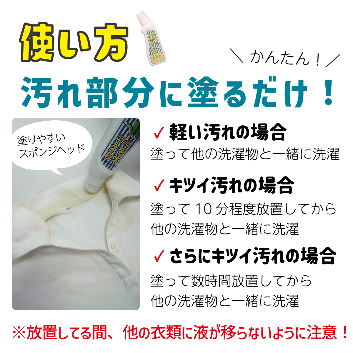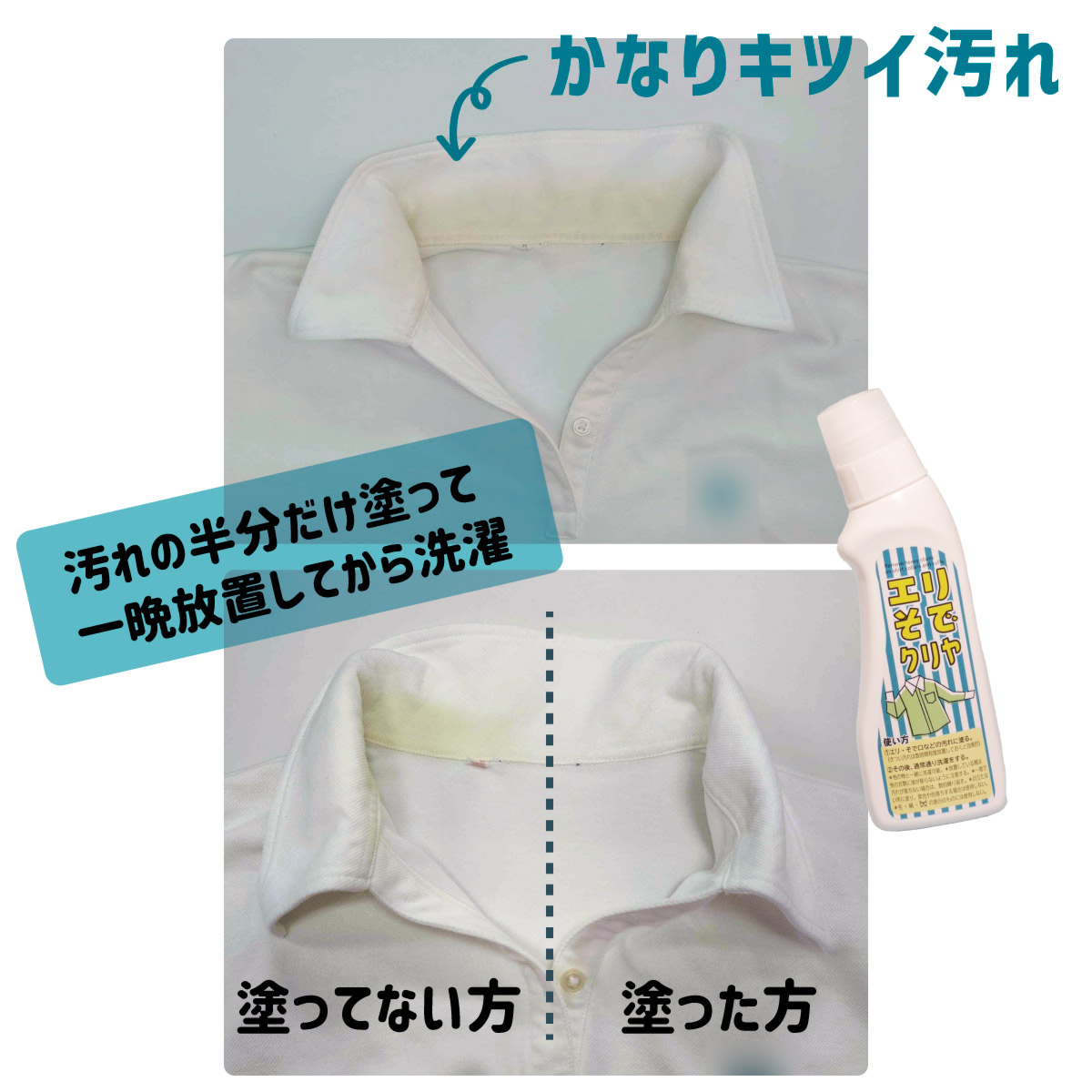 汚れた部分に直接えりそでクリヤを塗り、短時間放置後に通常の洗濯をするだけ!