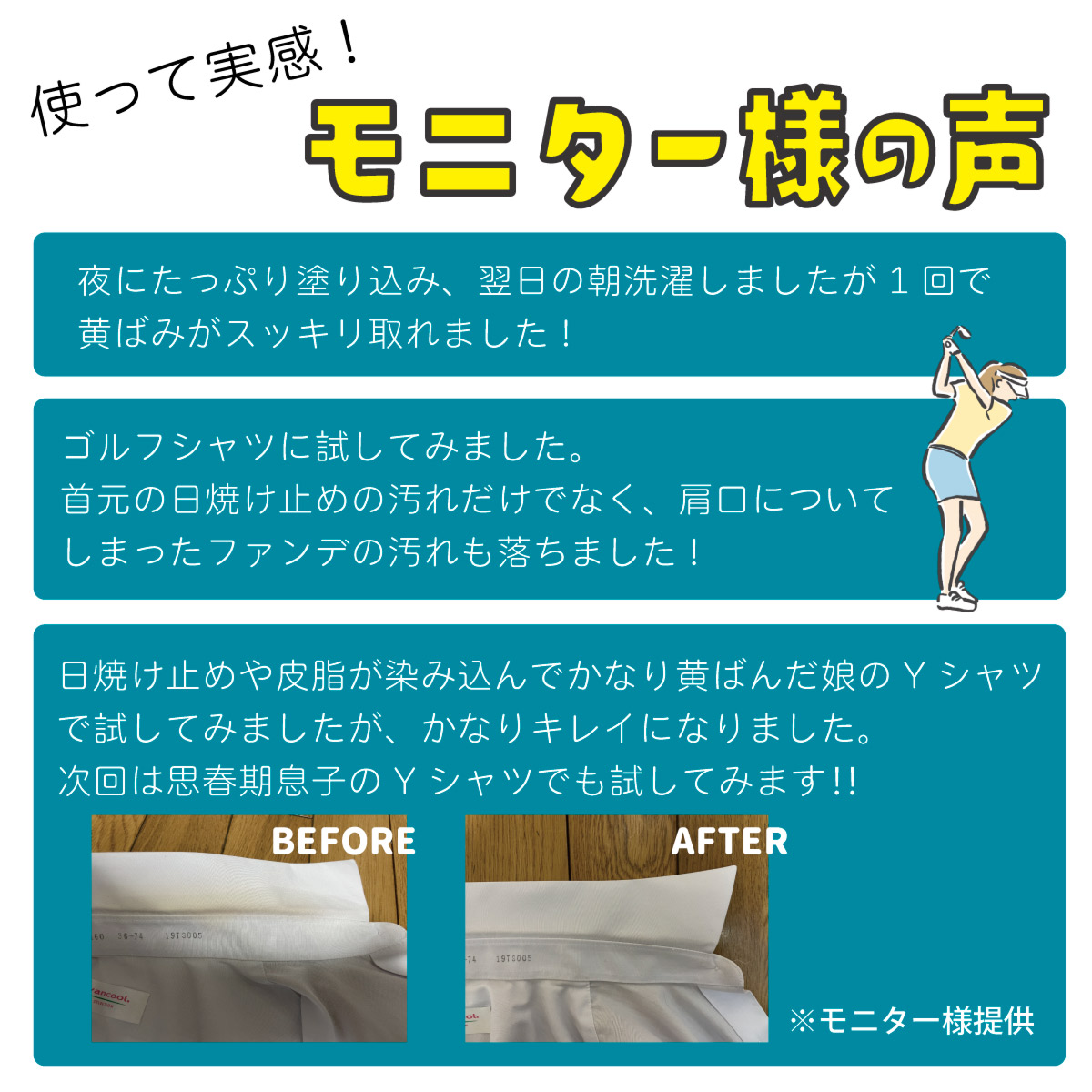 特に制服やポロシャツ、Yシャツなど、毎日使用する衣類の汗や皮脂の汚れ、UV効果の高い日焼け止めによる黄ばみを効果的に落とします。