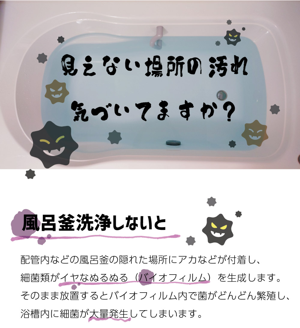 風呂釜の配管などの隠れた場所にアカが付着し、細菌類が繁殖します。