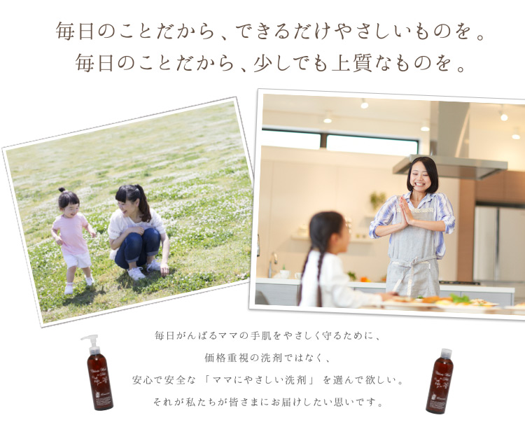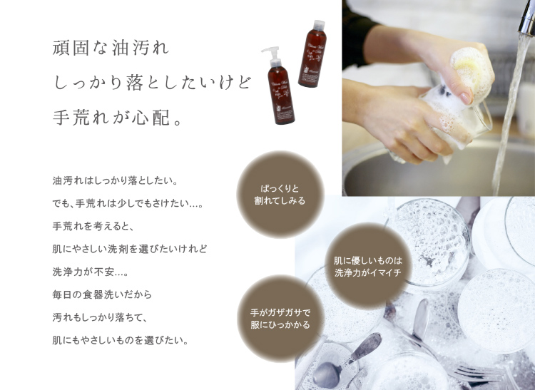 手荒れでお悩みの方に使ってほしい、洗浄力に必要な成分だけを配合した手肌にやさしい食器用洗剤です。