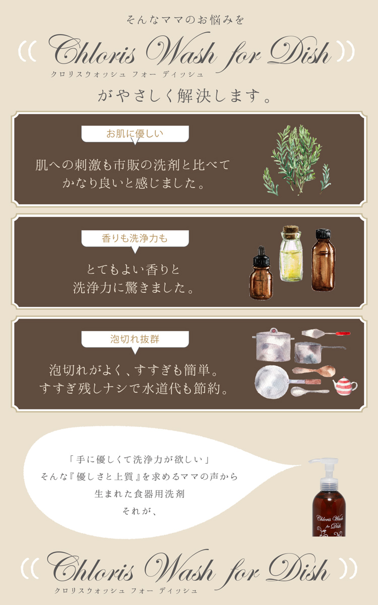 手にやさしくて洗浄力が欲しい、そんな「やさしさと上質」を求める声から産まれた食器用洗剤「Chloris Wash for Dish -クロリスウォッシュフォーディッシュ-」