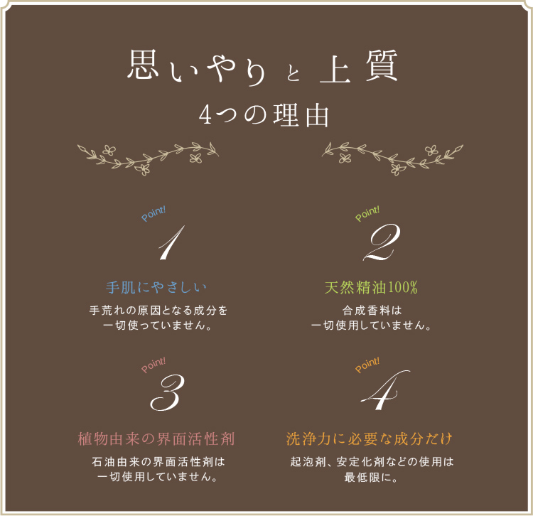 手荒れの原因となるアニオンアレルギー(肌タンパク質変性作用)を引き起こす界面活性剤ではなく、皮膚への刺激が穏やかなトウモロコシの糖を原料とした高価な界面活性剤を使用しています。