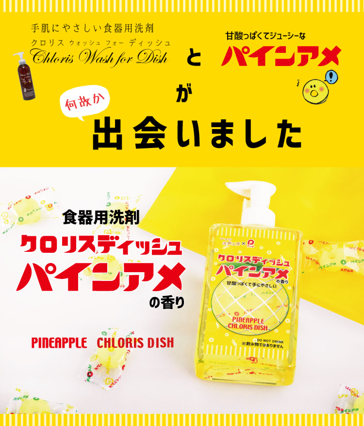 手肌にやさしい食器用洗剤「Chloris Wash for Dish -クロリスウォッシュフォーディッシュ-」と、愛されてロングセラーの「パインアメ」がコラボレーション!