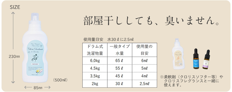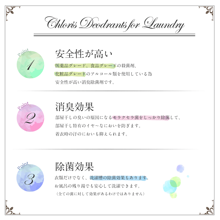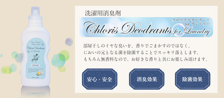 ●気になる臭いや、部屋干しの臭いにも洗濯用除菌消臭剤「Chloris Deodrants」