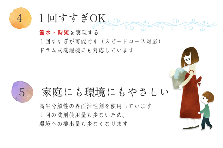 高生分解性の界面活性剤を使用し1回の使用量が少ない為、環境へ排出する洗剤量も少なく、家庭にも環境にもやさしい洗濯洗剤です。